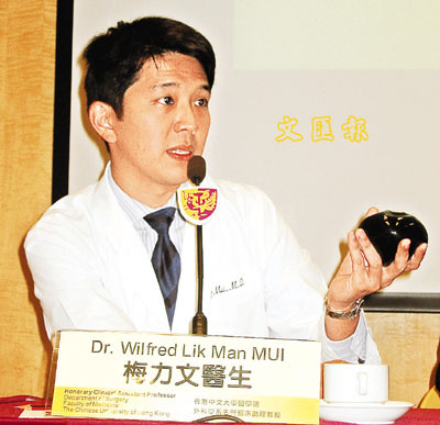 外科学系名誉临床助理教授梅力文介绍说,胃球可注入500立方厘米的盐水,最大直径达15厘米。手术只花30分钟,水球可放于胃内6个月,并可还原或重置水球,副作用极少。
