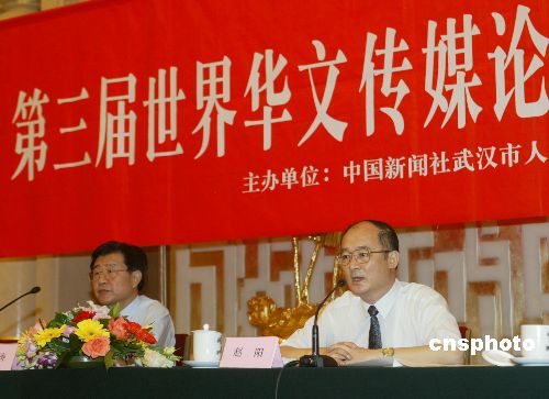 八月十二日,国务院侨办副主任赵阳(右)、中共武汉市委副书记殷增涛(左)出席在北京人民大会堂举行的“第三届世界华文传媒论坛”新闻发布会。由中国新闻社、武汉市人民政府主办的“第三届世界华文传媒论坛”将于九月十一日在武汉市召开。作者:史利