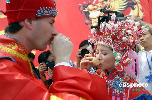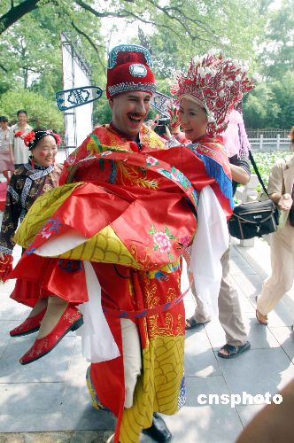 8月14日,济南市大明湖景区,来自荷兰的杨文轩(Jan)先生与济南姑娘党妍举行了一场传统的中国式婚礼,婚礼上俩人按照中国的传统习俗举行了坐花轿、掀盖头、夫妻对拜等仪式。新娘党妍今年28岁,2003年9月远赴荷兰爱因霍芬科技大学学习计算机专业,同年认识了荷兰小伙杨文轩(Jan),从此就开始了这段跨国姻缘。作者:龚辉