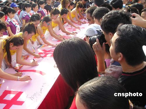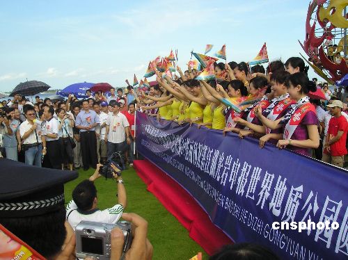 8月14日,2005年亚洲小姐(中国赛区)进入总决赛的20名候选佳丽来到广东湛江,倾情支持该市湖光岩申报世界地质公园。作者:马灿