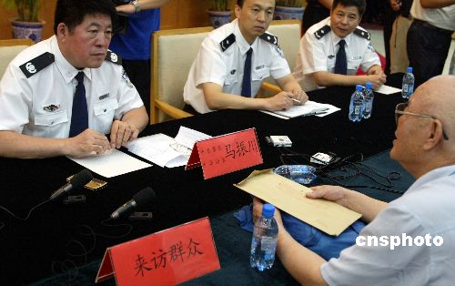 八月十八日,北京市公安局局长马振川(左)接待来访的京城市民,倾听来访民众反映的实际问题。今天,北京警方共设立了二十个接待点集中接待来访市民。作者:任海霞