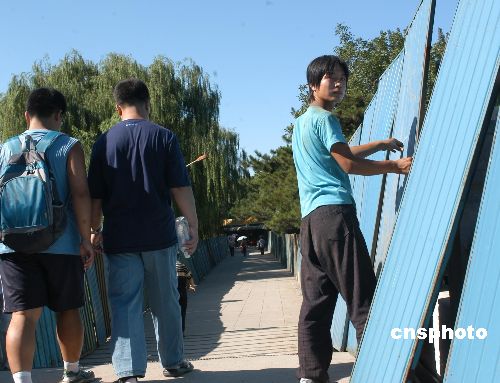 图为圆明园三园之一的绮春园工人在继续设置封闭铁板。按照环保总局要求,绮春园除入水口外,已铺防渗膜应全部拆除,回填黏土和原湖底底泥。作者:邹宪