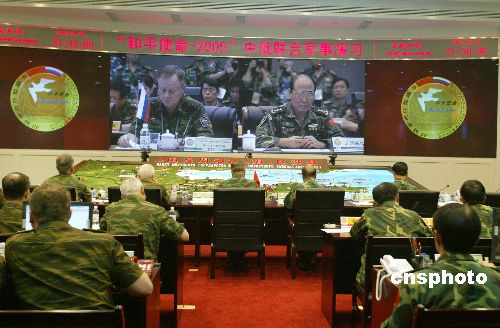8月20日,参加联合军演的中俄双方指挥员在导演部大厅观摩第二阶段演习。当日,“和平使命——2005”中俄联合军事演习第二阶段——战役筹划阶段在中国青岛开始。作者:王丽南