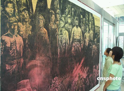 8月中旬,山西省阳泉市群艺馆制作完成中国国内最大的一幅版画“太行丰碑”,此巨幅版画是群艺馆为纪念抗战胜利60周年,组织9名美术工作者历时一个半月共同创作完成的,版画长3.60米,高2.40米,由百团大战等6部分组成,再现了抗战时期我广大军民众志成城、抗击日寇的历史场景。作者:续敏