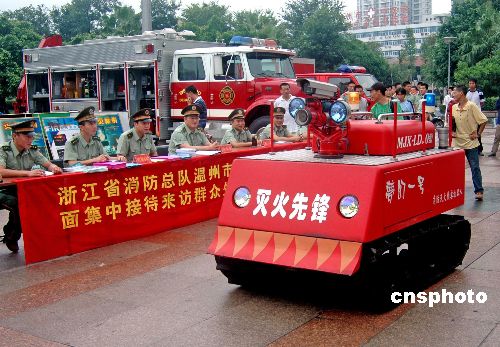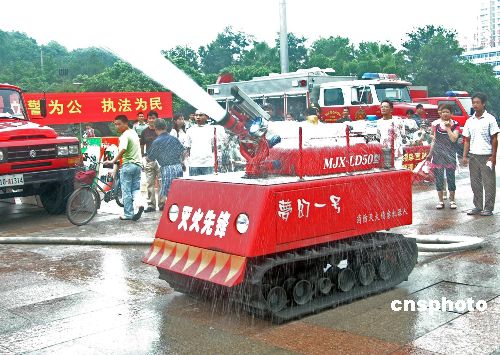 2005年8月21日上午,一辆坦克形状的消防机器人在浙江省温州市亮相,并在指挥人员的操控下现场进行演练,让市民大开眼界。据了解,这辆无人驾驶的机器人可以在极度危险环境下开展灭火。作者:刘飞