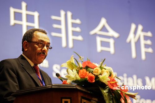 8月22日,为期两天的中非合作论坛第四届高官会在北京开幕,来自中国和非洲46个国家的代表、6个非洲地区组织的观察员以及非洲驻华使节出席了开幕式。中非合作论坛是中国和非洲于2000年共同创立的集体对话与合作机制,已分别举办了两届部长级会议。图为论坛共同主席国、埃塞俄比亚政府论坛特使海尔基洛斯·格塞塞在开幕式上致辞。作者:武仲林