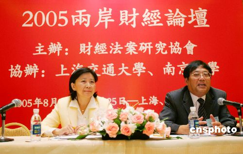 八月二十二日,“二○○五两岸财经论坛”在上海举行,多名中国国民党籍、亲民党籍“立委”以及三十多名台湾金融界知名人士出席了本次论坛。图为亲民党籍“立委”刘忆如(图左)与上海交大安泰管理学院院长(右)王方华在本次论坛上。作者:汤彦俊
