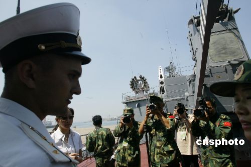 八月二十二日,中国部分媒体被中俄军事演习俄军方邀请,参观采访此次参加演习的俄罗斯反潜舰,这艘停靠在青岛港的舰艇正整装待发,明日将起航参加海上封锁演习。图为中国军方记者对一位在舰上值勤的俄海军军官产生浓厚兴趣。作者:王丽南