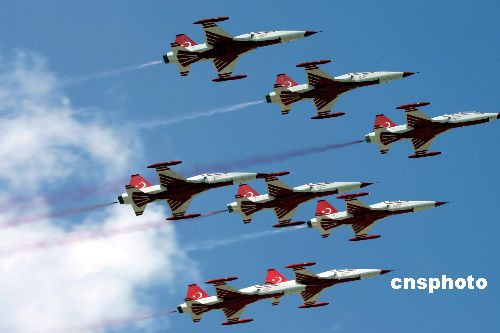 F1大奖赛土耳其站正式比赛结束21日晚。迈凯轮车队的芬兰车手雷克南一路领先,并率先完成比赛获得首届土耳其大奖赛的冠军。法拉力车队的七次世界冠军舒马赫因撞车推出了比赛。图为开幕式上土耳其空军表演队列队表演,为比赛助兴。作者:Ic/cnsphoto