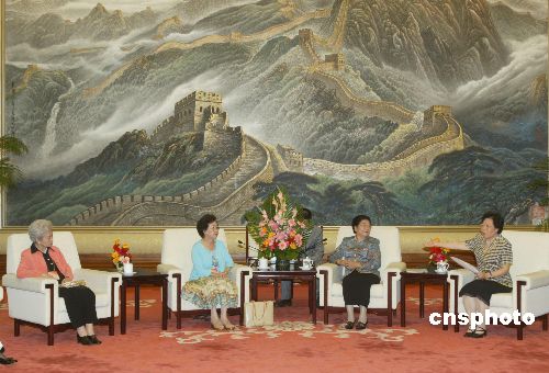 八月二十三日,全国人大常委会副委员长顾秀莲(右二)、国侨办主任陈玉杰(右一)在北京人民大会堂会见美大地区华侨华人妇女代表团。来自美洲、大洋洲八个国家的六十余名华侨华人妇女杰出人士是应国务院侨办的邀请来华访问的。作者:史利