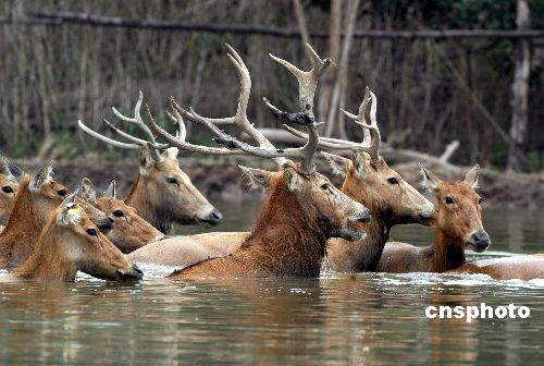 八月二十三日,北京麋鹿生态实验中心内的麋鹿在悠闲地在水中乘凉。麋鹿作为国家一级保护动物,世界“受危级”物种,曾仅产中国。清末,由于天灾人祸,麋鹿作为一个物种,在中国灭绝了。幸有少量个体在其灭绝之前被引种到欧洲,最终在英国繁衍下来。1985年,麋鹿结束百年“华侨”生涯,回归故里——中国北京。二零零五年麋鹿返家二十周年之际,数量已达到二千头左右。作者:张宇