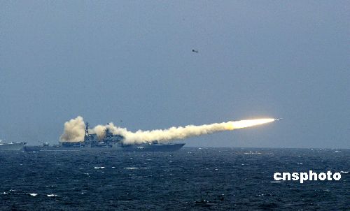 “和平使命-2005”中俄联合军事演习第三阶段8月23日在中国山东半岛及其附近海域举行。图为俄罗斯驱逐舰发射先进的反舰导弹。作者:王丽南