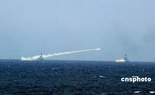 八月二十三日,“和平使命——2005”中俄联合军事演习第三阶段在中国山东半岛及其附近海域进行。图为多艘护卫舰齐射舰舰导弹。作者:王丽南
