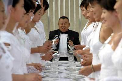 昨天,奥体中心游泳馆的一个平台上,一下子出现了三十位身穿白色婚纱的新娘,这个场面难道是有人在这里组织集体婚礼?看到一旁的摄影机,才知道原来这里是潘长江处女专辑《男人40一枝花》同名歌曲MV的拍摄现场。一张长条桌子两侧站着30位漂亮的新娘,而众星捧月之中是身穿黑色燕尾服的笑星潘长江。最搞笑的是当老潘揭开面前一只巨大的盘子盖,原以为是大餐的他失望地发现里面只放着一个小汉堡。
