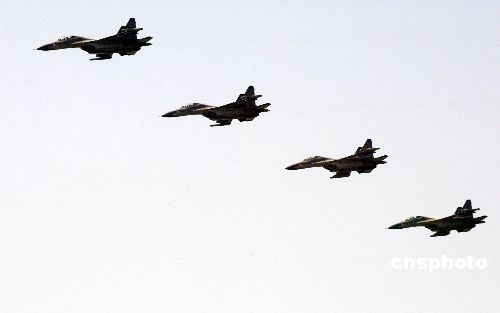 中俄联合军事演习海上封锁演练中,苏-27飞机以编队形式飞过战区,与舰艇协同作战。作者:王丽南