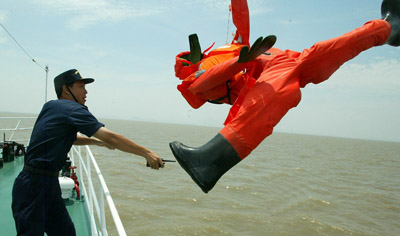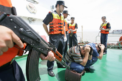 在这次演习中,靠帮和跳帮是缉私队员着重锻炼的两个技术动作。“涉嫌走私船是不会乖乖听话让我们靠上去的。”杭州海关缉私局海查科长杨政说。今年1月,舟山缉私分局的一艘缉私艇在追击一艘涉嫌走私冰冻白鱼的渔船时,渔船边逃边摆尾,缉私艇根本无法靠船跳帮。追击了一天一夜后,在温州缉私分局一艘缉私艇的夹击下才终于靠近渔船,缉私队员在两船起伏落差较大情况下跳帮过去,控制住了走私渔船。