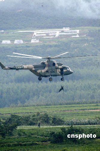 八月二十四日,“和平使命—2005”中俄联合军事演习第三阶段两栖登陆作战实兵演练在山东半岛展开。图为中国特战队员实施绳降。作者:王丽南
