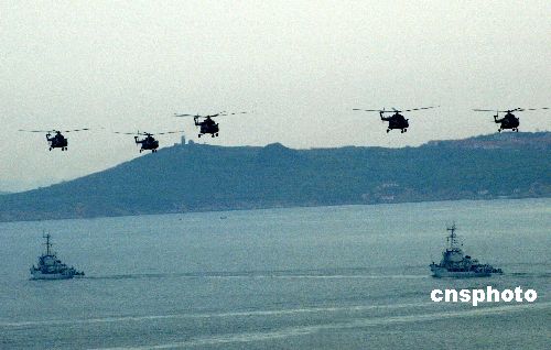 八月二十四日,“和平使命—2005”中俄联合军事演习第三阶段两栖登陆作战实兵演练在山东半岛展开。图为直升机呈梯级在舰艇上空盘旋掩护舰艇向岸防挺进。作者:王丽南