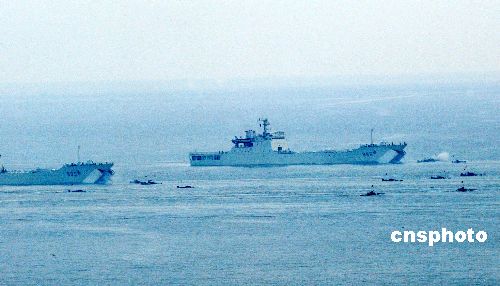 八月二十四日,“和平使命—2005”中俄联合军事演习第三阶段两栖登陆作战实兵演练在山东半岛展开,参加两栖登陆作战实兵演练的中俄海军陆战队水陆坦克从登陆艇下载后向岸边突击。作者:王丽南