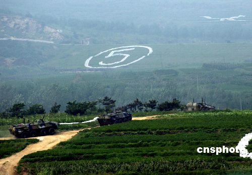 八月二十四日,“和平使命—2005”中俄联合军事演习第三阶段两栖登陆作战实兵演练在山东半岛展开。图为参加两栖登陆作战实兵演练的装甲运兵车登陆后,向纵深挺进。作者:王丽南