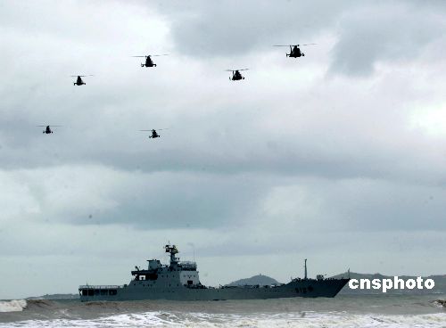 八月二十四日,“和平使命—2005”中俄联合军事演习两栖登陆作战实兵演练在山东半岛展开。图为参加两栖登陆作战演练的直升机在风云变幻的海天间掩护俄罗斯舰艇前进。作者:王丽南