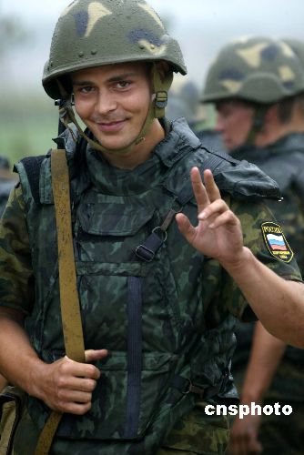 八月二十四日,“和平使命—2005”中俄联合军事演习两栖登陆作战实兵演练在山东半岛如期进行。图为完成登陆任务后的俄罗斯陆战队员,尽管全身湿透,仍中国记者微笑致意。作者:王丽南