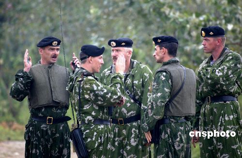八月二十四日,“和平使命—2005”中俄联合军事演习两栖登陆作战实兵演练在山东半岛如期进行。图为完成登陆任务后的俄罗斯陆战队军官,交流任务完成情况。作者:王丽南