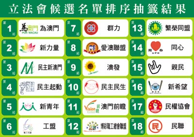 澳门公职局于二十四日下午三时半在公共行政大楼演讲厅抽签,为体现公平原则,抽签过程完全由候选组别代表操作。由于间选四个选举组别各有一份候选名单,不须抽签。