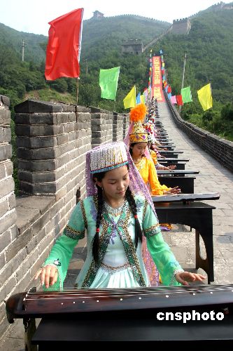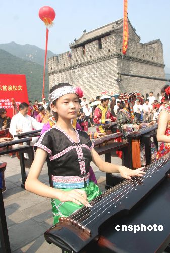 八月二十六日,居庸关长城琴声悠扬,身着56个民族盛装的古琴演奏者,在天下第一雄关用镌刻着56个民族历史文化和风情习俗的56把极品古琴演奏了《梅花三弄》、《流水》、《关山月》《歌唱祖国》等千古名曲和时代新歌,庆祝中华人民共和国建国56周年。张勤