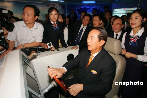 亲民党主席宋楚瑜(中)在上海参观上海城市规划馆时,饶有兴趣地驾驶着电子游艇,遨游“浦江”。作者:潘索菲