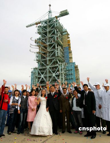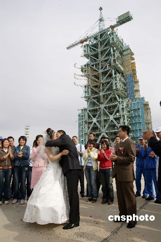 10月1日,国庆节,在中国载人航天发射场,“神舟”六号飞船的发射塔架下,举行了一场特殊的婚礼。来自中国酒泉卫星发射中心的一线科技干部杨延峰,和到发射场执行“神舟”号任务的中国航天科技集团第八研究院的王蕾小姐,在这里喜结良缘。他们相识于“神舟”二号任务中,相知、相恋于“神舟”三号、四号、五号任务时。今天在举国同庆祖国56周年华诞之际,他们以隆重而简朴的婚礼方式,预祝“神舟”六号载人航天飞行任务取得圆满成功。
