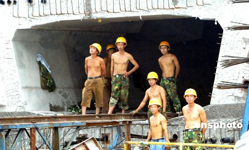 浙江宁波8月中旬推出建筑企业工资支付担保制度、农民工欠薪应急周转制度、全天候“追薪热线”、开辟“维权绿色通道”对劳动争议案件实施快速处理、农民工可先行参加工伤保险等五条措施,以保障外来务工人员的各项合法权益。图为2005年8月29日,宁波一工地的外来务工人员在工作中。 作者:张和平