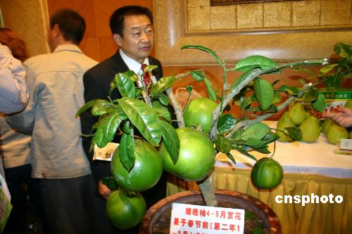 图为会议现场展示的农业科研成果遂宁矮晚柚。作者:鲁彦