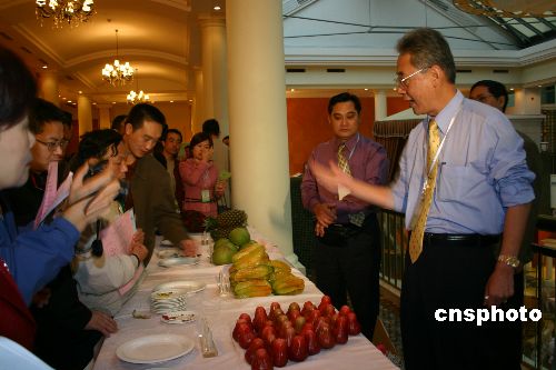 图为台湾高雄县农会秘书萧汉俊(右一)为参会代表介绍台湾特产水果连雾和杨桃。作者:鲁彦