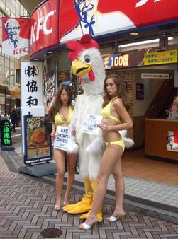 中新网10月28日电 据《今日日本》报道,27日,“善待动物组织”的两名女性成员身穿比基尼出现在东京涩谷的一家肯德基店前。
