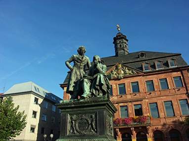 童话之路的起点哈瑙距离法兰克福仅需约二十分钟的车程,是格林两兄弟诞生并居住至五岁左右的地方。哈瑙在十八世纪时以黄金和宝石工艺闻名,经济颇为富裕,在这个时代出生的格林兄弟,家境亦不俗,格林一家居住的房屋原本就在哈瑙的市广场旁边,可惜在二次大战时遭空袭,被夷为平地,原址只留下一块纪念碑。但同样在广场之上的格林兄弟纪念铜像则出奇地完整无缺,与卡塞尔的站立像不同,铜像上站着的是哥哥雅各,弟弟威廉则坐着看书,原来威廉身体一向很弱,雅各让座给弟弟,正代表了兄弟情深,事实上格林两兄弟不但一起搜集和编写童话故事,一生中大部分时间亦一起生活。