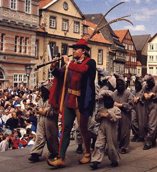 《彩衣吹笛人》这个拐子佬的故事,原来情节并非纯粹编来吓小孩,是有根有据取材自1284年的小孩集体失踪事件,而故事发生的地点便正是哈美恩。当年的有130个小孩突然失踪,各界对这件事有很多解释,民间亦有很多不同说法,格林童话中的彩衣吹笛人便是其一。当时哈美恩的粉业十分兴旺,因而有鼠祸为患,村民于是聘请了能用笛声诱鼠出城的彩衣人驱鼠,事后村民却拒付酬劳。一个星期天,彩衣人趁村民上礼拜堂之际,用笛声诱走全城小孩作为报复。