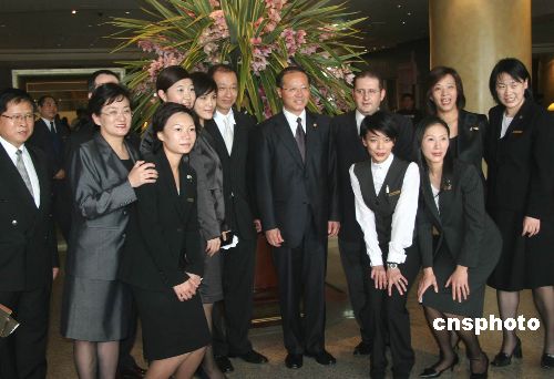 中国旅游协会会长邵琪伟(左三)率领的大陆赴台旅游考察团一行六十六人,结束为期十天的台湾之行,于十一月六日下午离开台湾前往澳门。图为邵琪伟离开前与在台北时下榻的宾馆员工合影。作者:黄少华