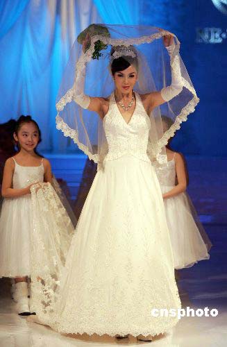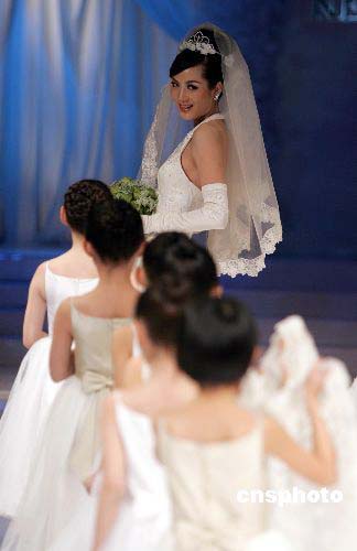 十一月二十一日晚,NE.TIGER高级婚纱礼服系列二零零六春夏流行趋势发布会在中国国际时装周上举行,模特演绎以“爱”为主题的皮草时装流行趋势。作者:毛建军