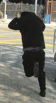 被告昨天离开法院时拔足狂奔,冲上一辆的士后绝尘而去。