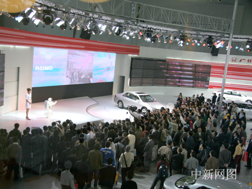本田智能机器人Asimo吸引了不少专业观众和绝大部分小朋友的注意力。图为展示智能机器人时,被围得水泄不通的广州本田展台。(郜威伟)