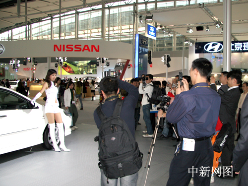丰田展台前挤满了观众和记者,这位模特的吸引力可见一斑。(郜威伟)