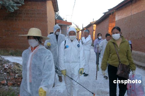 十一月二十三日下午,高致病性禽流感防控人员在云南省楚雄市富民镇荷花村进行全方位消毒。中国农业部二十二日称,云南省楚雄市富民镇荷花村发生高致病性禽流感。当地政府正组织人员对疫区点三公里范围内扑杀家禽。作者:甘娜
