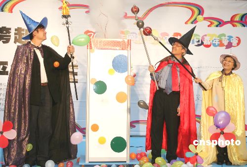 图为“台北市副市长”金溥聪(右)等以一身魔法师装束在开幕式上表演。