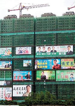 “三合一”选战已进入倒数时刻,属于超级战区之一的台北县选情紧绷,板桥市一栋正在建造的大楼,成为各候选人兵家必争之地,挂满巨型竞选布条,格外显眼。(台湾联合报图)