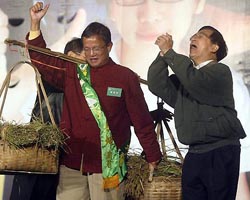 陈水扁23日卯足了劲帮民进党苗栗县长候选人邱炳坤(左)助选,将象征县政重担的扁担交给邱炳坤,邱炳坤顾不得扁担挑反了,全力承接。(台湾联合报图)