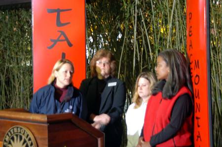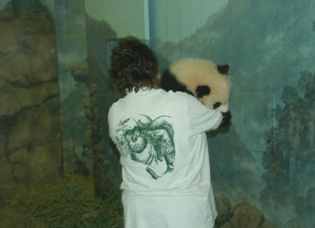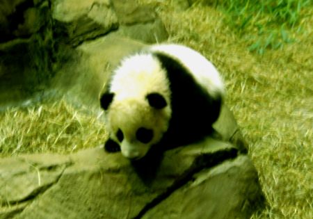 二十九日清晨七点钟举行的“媒体见面会”,吸引了几乎所有美国主流媒体和许多外国记者,美国多个电视网还进行现场直播。上百名记者被分成五组进入熊猫房一睹为快。面对摄像摄影记者的“长枪短炮”,小“泰山”初展风采,毫不怯场地翻滚嬉戏,旁若无人地信步遛达;一会儿蹒跚摇晃地要爬上岩石,一会儿叼起竹棍仿佛在抽烟,一会儿玩累了趴下,乌溜溜的眼睛好奇地盯着玻璃幕外的人群。在场记者见状,无不开怀大笑。
