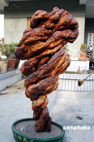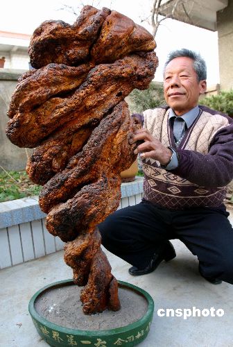 12月3日,江苏省连云港市老人金同柱与他制作的蘑菇云盆景在一起。不久前,金同柱在社区的一个砖厂意外发现了一枚酷似原子弹爆炸后产生的蘑菇云柳树桩,后来经过他进行简单加工后,制作成了维妙维肖的蘑菇云盆景。 作者:王健民