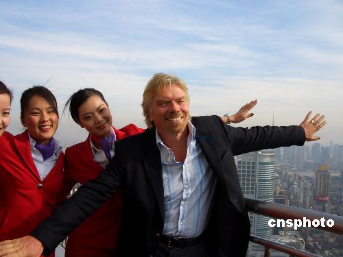 十二月五日,英国维珍航空董事长、国际知名人士理查德·布兰森在上海披露,该公司已在筹备的一项人类太空旅行计划将推出全球最低价:二十万美金一人,游客可享受到往返太空的全程优质服务。图为理查德·布兰森在上海浦西最高楼之一——明天广场的顶端表示,维珍将在未来两年内建造五艘太空船,还计划建造一座“太空酒店”。 作者:许晓青
