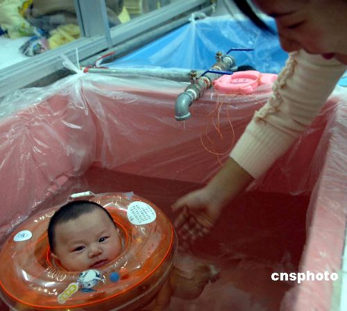 连日来,无锡市气温陡降,最低温度零度以下。为避免新生婴儿在家洗澡时着凉,不少年轻的父母将新生婴儿抱到游泳中心洗澡、按摩,新生婴儿游泳中心的生意十分红火。 据悉,新生婴儿戏水,可促进婴儿脑神经的生长发育,提高婴儿适应外部环境的能力。 作者:潘正光